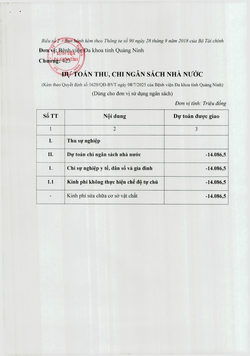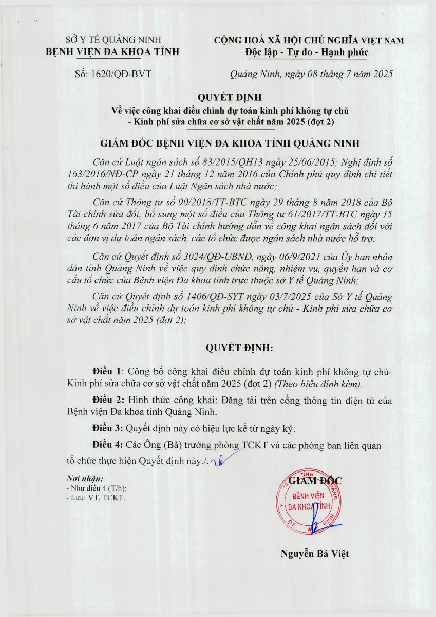 Quyết định về việc công khai điều chỉnh dự toán kinh phí không tự chủ - kinh phí sửa chữa cơ sở vật chất năm 2025 (1620)