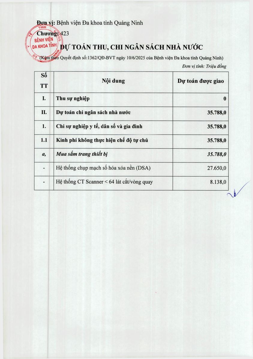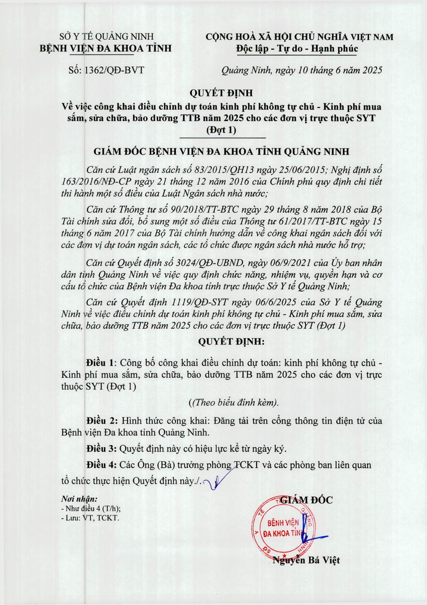 Quyết định v/v công khai điều chỉnh dự toán kinh phí không tự chủ - Kinh phí mua sắm, sửa chữa, bảo dưỡng TTB năm 2025 cho các đơn vị trực thuộc SYT (đợt 1) (1362)
