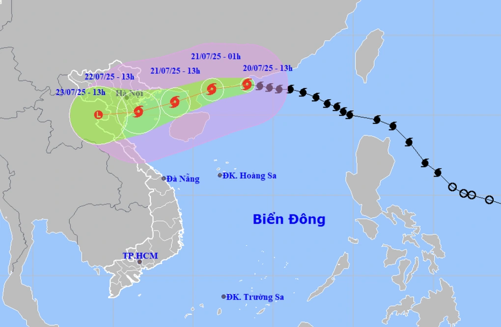 Đường di chuyển của bão Wipha cập nhật lúc 13h ngày hôm nay 20/7/2025 (Ảnh: NCHMF)