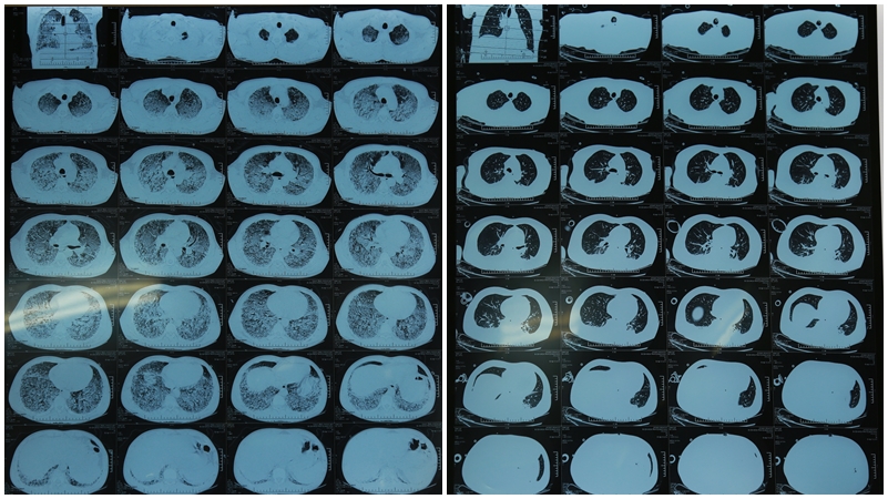 Phổi bị nhiễm trùng nặng tiến triển tốt hơn rất nhiều sau 5 ngày điều trị tích cực (Ảnh chụp cắt lớp vi tính phổi của bệnh nhân trước và sau khi điều trị)