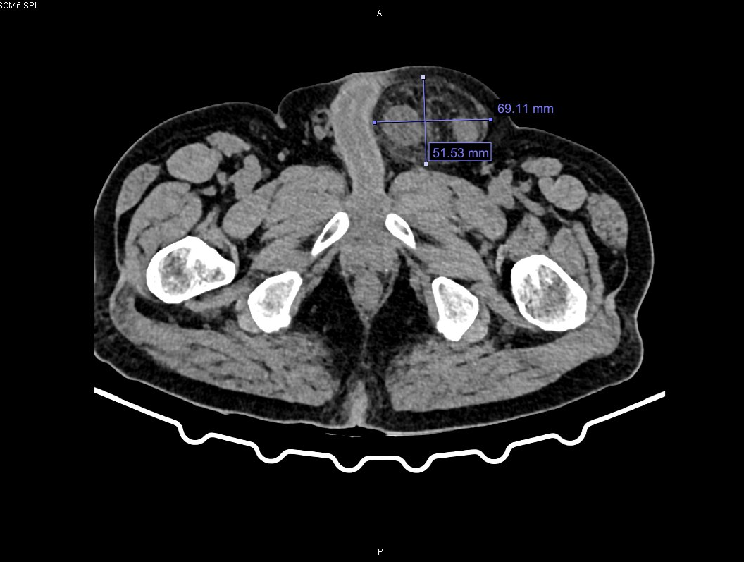Hình ảnh khối thoát vị bẹn trái nghẹt qua phim chụp cắt lớp vi tính.