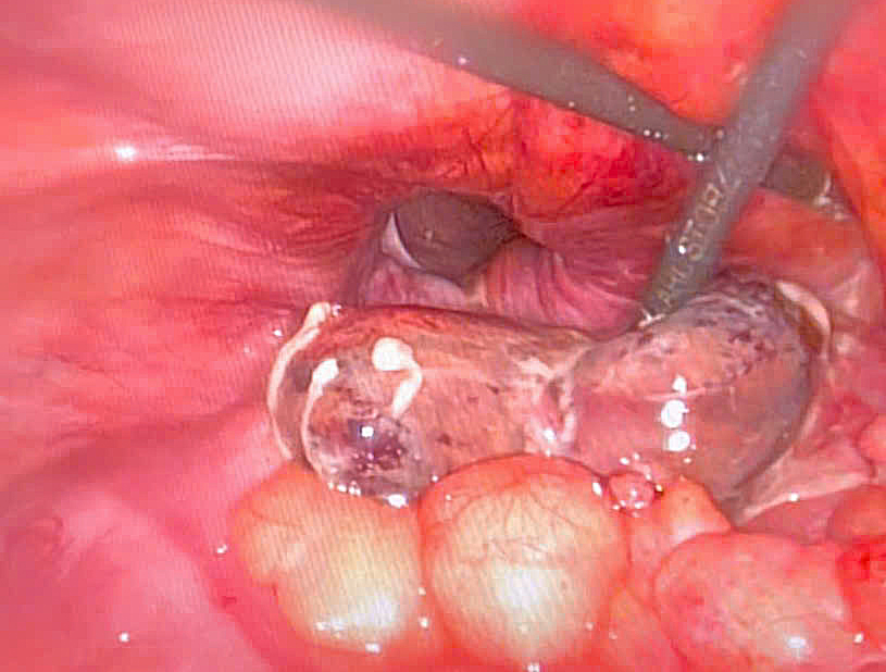Kíp mổ khoa Ngoại do bác sĩ Nguyễn Đình Quế phụ trách phối hợp với các cộng sự thực hiện. Qua đường rạch nhỏ 1cm ở thành bụng, phẫu thuật viên đưa camera vào kiểm tra phát hiện trong ổ bụng có nhiều dịch tiêu hóa lẫn nhiều giả mạc, biểu hiện tình trạng viêm nhiễm nặng, lỗ bẹn phải bình thường, lỗ bẹn trái có đại tràng chui vào gây nghẹt. Giải phóng khối thoát vị, các bác sĩ nhận thấy đoạn đại tràng sigma đã bị hoại tử đen.