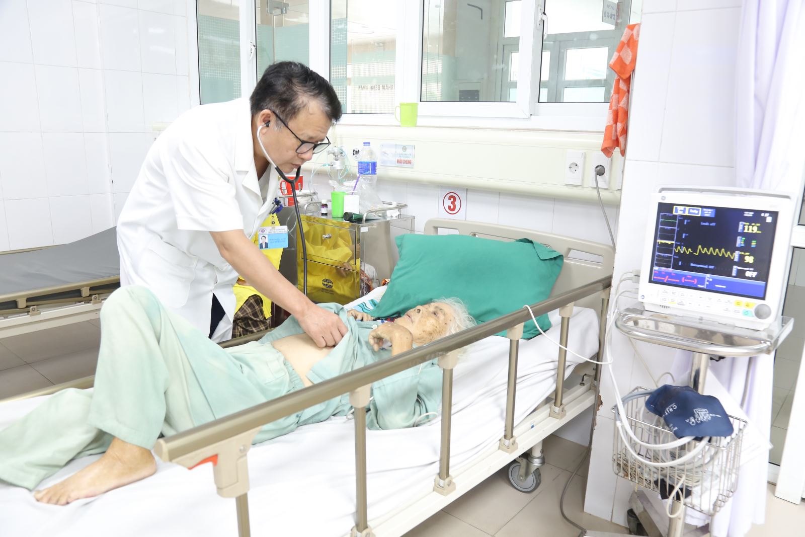 BSCKII Nguyễn Bá Việt- Giám đốc bệnh viện Đa khoa tỉnh trực tiếp thăm khám và tiếp thu, lắng nghe ý kiến của người bệnh, người nhà người bệnh trong công tác chăm sóc và điều trị bệnh