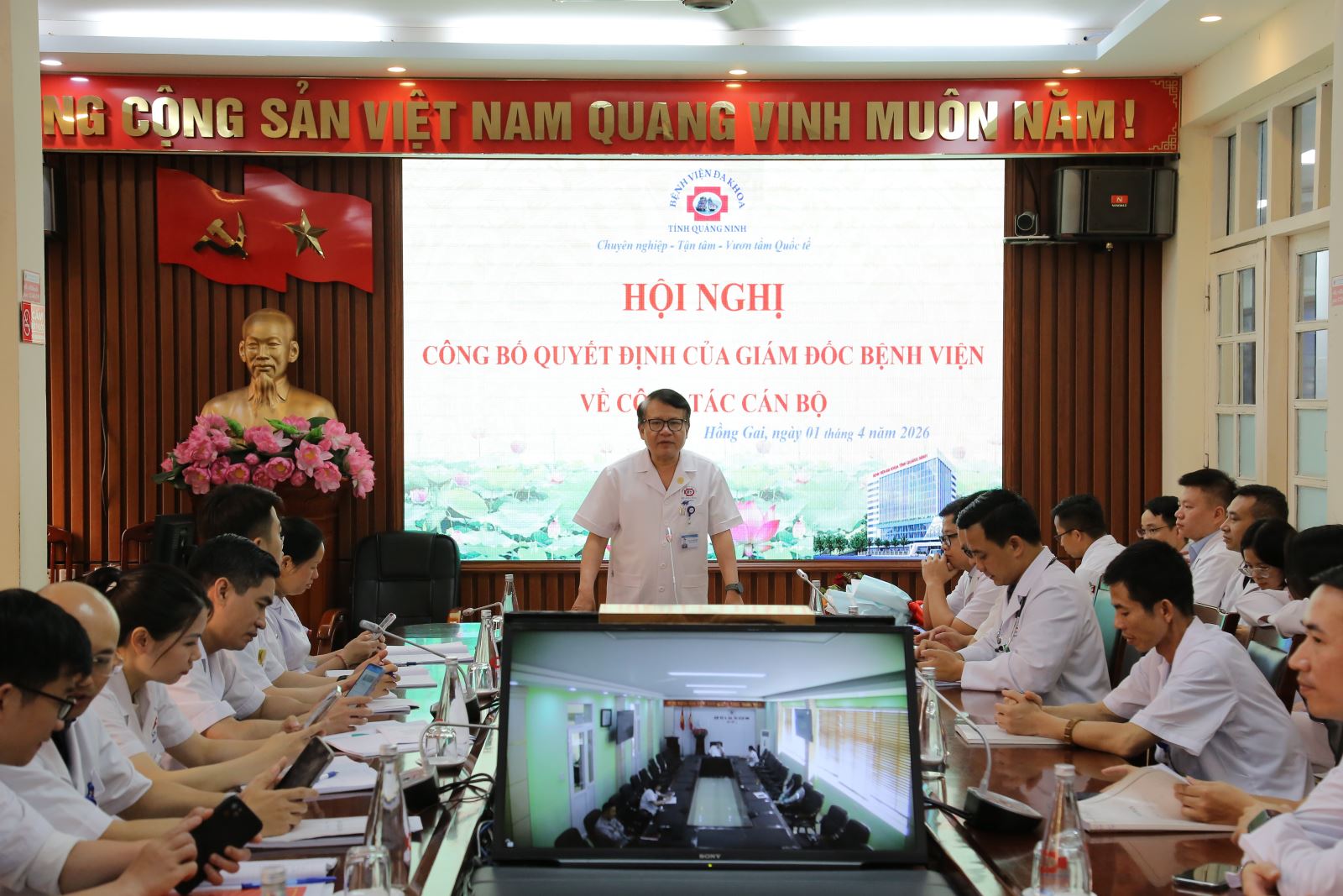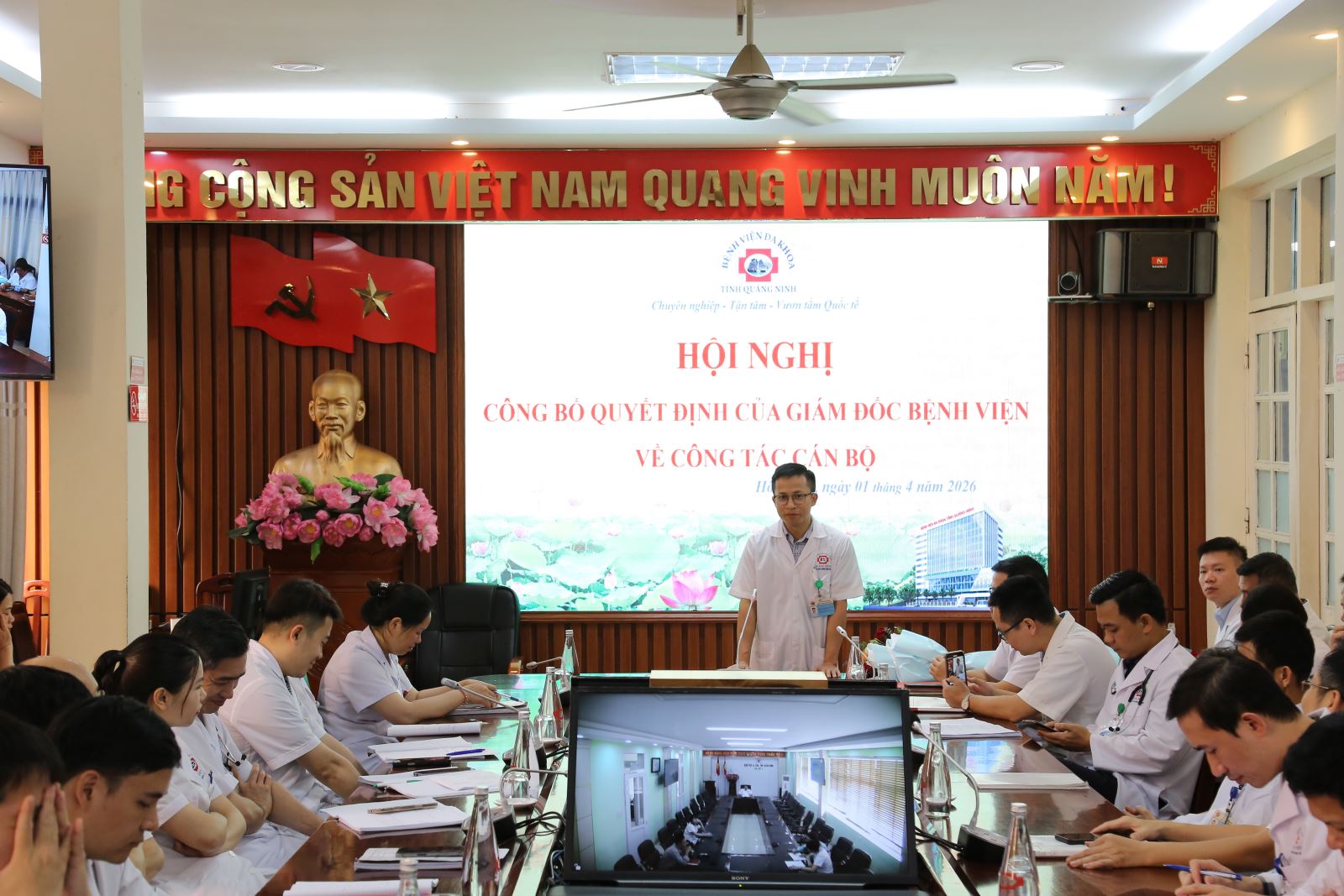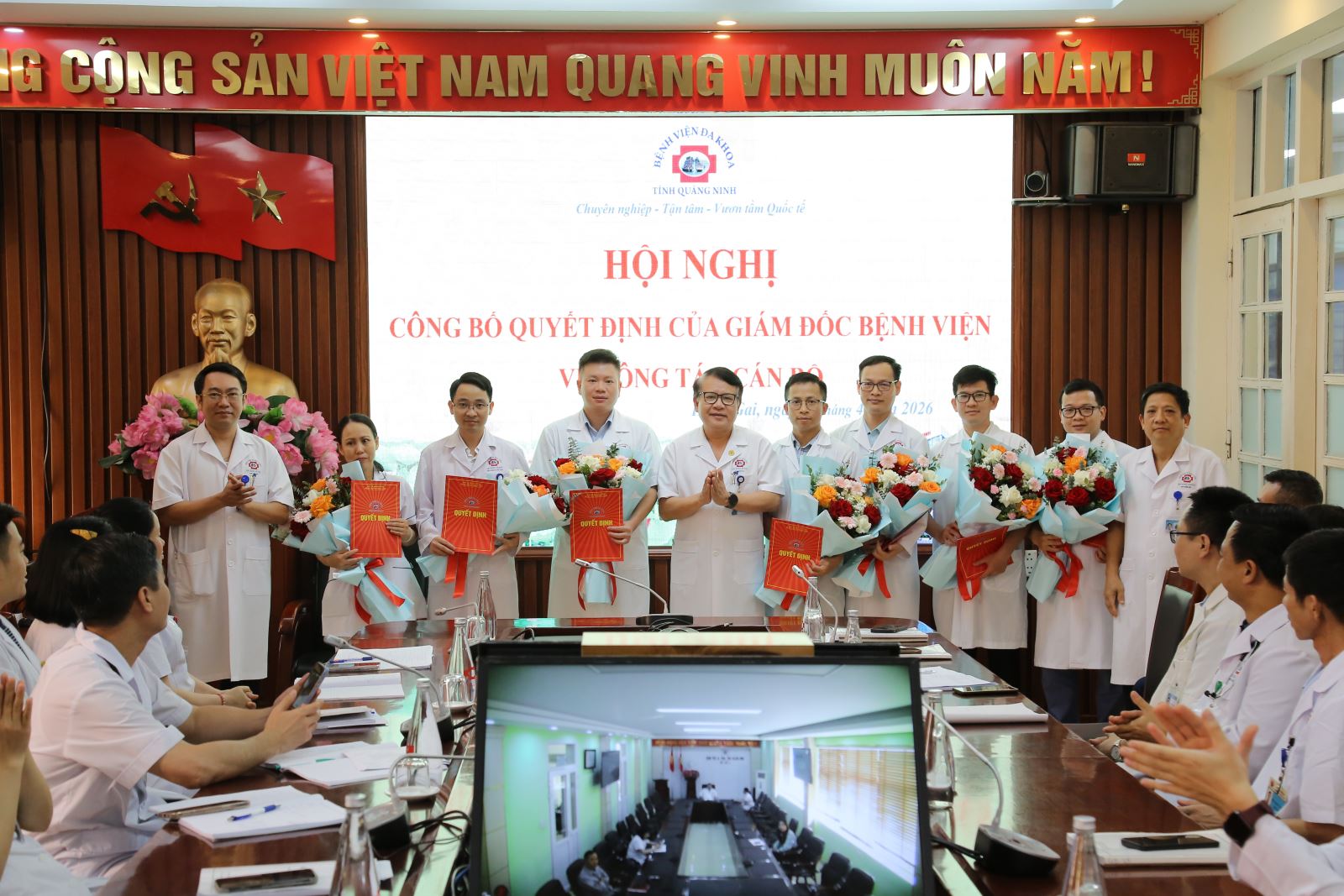 Sáng 01/04/2026, Bệnh viện Đa khoa tỉnh Quảng Ninh tổ chức lễ công bố các quyết định của Giám đốc bệnh viện về công tác cán bộ đối với một số vị trí quản lý các khoa lâm sàng, cận lâm sàng nhằm tiếp tục kiện toàn tổ chức bộ máy, đáp ứng yêu cầu nhiệm vụ trong giai đoạn mới. TTƯT, ThS, BSCKII Nguyễn Bá Việt – Giám đốc Bệnh viện dự và trực tiếp trao các quyết định.