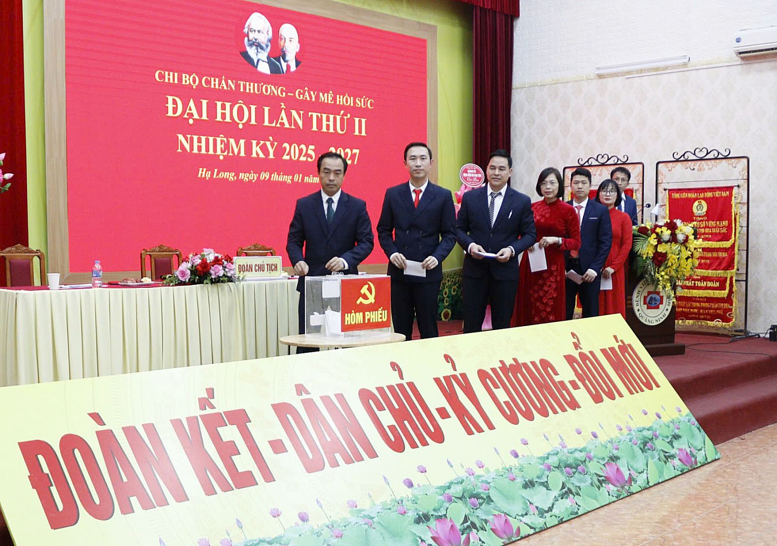 Với tinh thần làm việc khẩn trương, nghiêm túc và trách nhiệm, Đại hội đã tiến hành bầu Chi ủy Chi bộ nhiệm kỳ 2025-2027 với 3 đồng chí. Đồng chí Lương Toàn Thắng- Trưởng khoa Chấn thương chỉnh hình được bầu giữ chức Bí thư chi bộ Chấn thương- Gây mê hồi sức, lần thứ II nhiệm kỳ 2025-2027; đồng chí Phạm Trung Đức - Phó phụ trách khoa Gây mê hồi sức được bầu giữ chức Phó Bí thư chi bộ Chấn thương - Gây mê hồi sức.