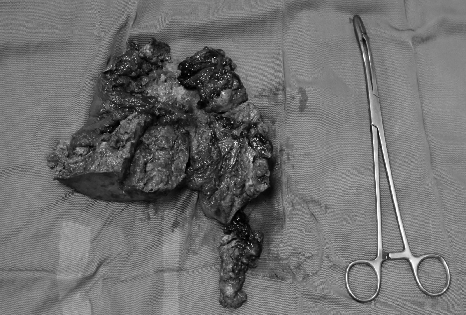 Phần gan bị dập nát phức tạp được xử trí cắt bỏ.