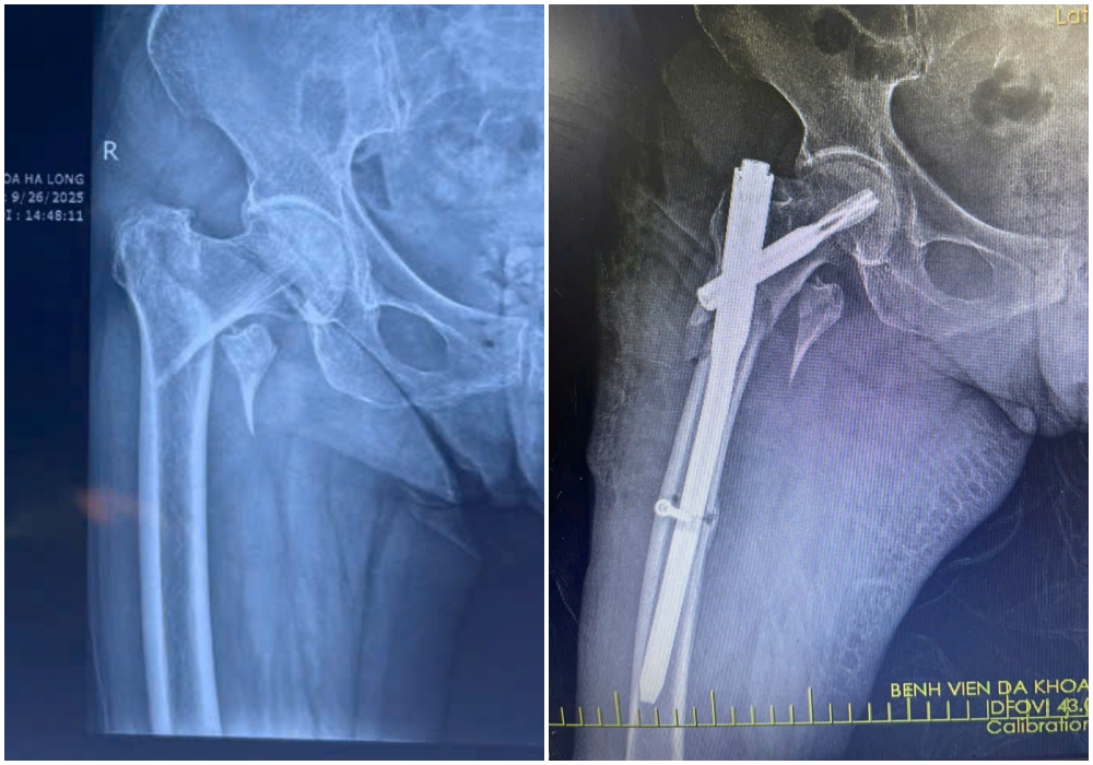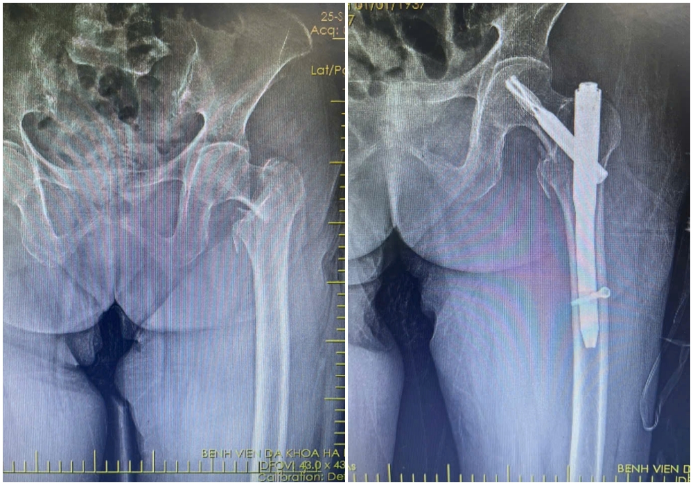 Hai bệnh nhân cao tuổi là Nguyễn Thị H. (88 tuổi) và Nguyễn Thị N. (87 tuổi), cùng trú tại phường Hoành Bồ, tỉnh Quảng Ninh. Cả hai trường hợp đều nhập viện trong tình trạng đau nhiều, mất vận động khớp háng sau khi bị ngã ở nhà. Kết quả chụp X-quang xác định bệnh nhân bị gãy liên mấu chuyển xương đùi. Với tình trạng tuổi cao, sức yếu, việc vận chuyển bệnh nhân hạn chế, tiềm ẩn nguy cơ làm vị trí gãy thêm trầm trọng. Sau khi liên hệ hội chẩn, Bệnh viện Đa khoa tỉnh Quảng Ninh đã cử kíp bác bác sĩ khoa Chấn thương chỉnh hình trực tiếp đến Bệnh viện Đa khoa Hạ Long để hỗ trợ phẫu thuật, đảm bảo an toàn cho người bệnh.