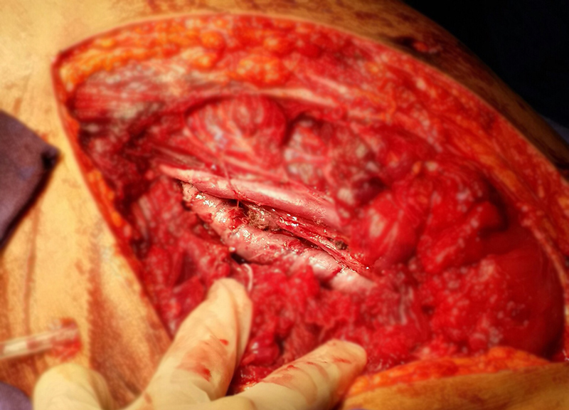 Phẫu thuật viên chính của kíp mổ là Ths Bs Phạm Việt Hùng (Trưởng khoa Ngoại) cùng các bác sỹ chuyên ngành chấn thương và mạch máu tiến hành mở rộng vết thương, phát hiện động mạch và tĩnh mạch đùi phải đều bị dập nát đoạn dài 10 cm không thể nối trực tiếp, buộc phải cắt bỏ phần hỏng và nối đoạn mạch ghép tự thân thay thế . Kíp mổ chia làm hai, một kíp mở chân trái lấy tĩnh mạch hiển lớn để làm đoạn mạch ghép, kíp còn lại nhanh chóng xử trí tổn thương, phần sinh dục và nối mạch. Phần động mạch đùi cắt bỏ được các bác sĩ khâu nối thay thế đoạn tĩnh mạch hiển đảo chiều khoảng 10cm lấy từ đùi trái bệnh nhân. Do kích thước phần tĩnh mạch hiển đùi trái nhỏ hơn rất nhiều tĩnh mạch đùi bị tổn thương nên phẫu thuật viên đã phải dùng toàn bộ tĩnh mạch hiển còn lại khoảng 40 cm quấn tạo hình thành ống nối có kích thước tương xứng để khâu ghép vào phần tĩnh mạch đùi dập nát còn lại.