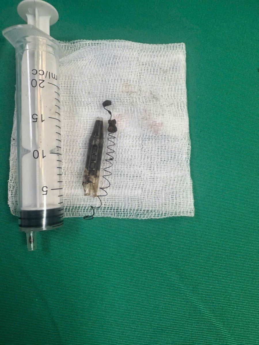 Ê-kíp phẫu thuật khoa Răng Hàm Mặt do BsCKII Bùi Công Tuấn – Phó khoa Răng Hàm Mặt đã tiến hành phẫu thuật, lấy thành công dị vật là đầu vỏ bút bi kèm lò xo ra khỏi cơ thể người bệnh, đảm bảo an toàn, hạn chế tối đa tổn thương các cấu trúc lân cận. Sau phẫu thuật, bệnh nhân ổn định, giảm đau rõ rệt và đang được tiếp tục theo dõi.