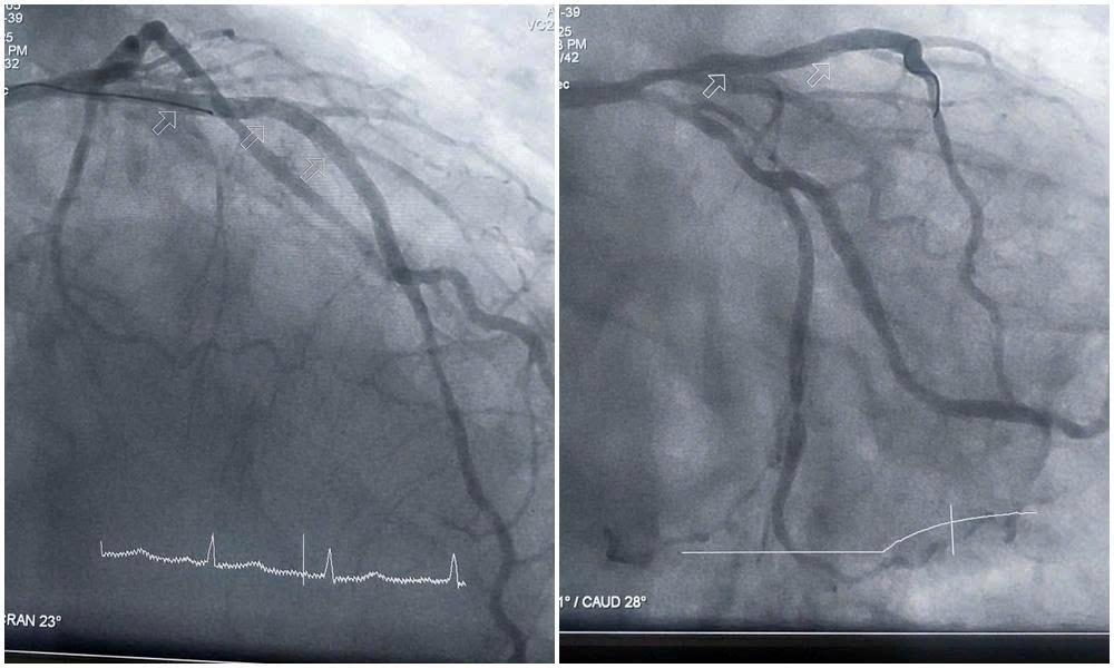 Với sự đồng thuận của gia đình, người bệnh lập tức được chuyển đến phòng can thiệp trong tình trạng huyết động không ổn định, chức năng tim suy giảm rõ rệt, đòi hỏi phải xử trí khẩn trương và chính xác. Kết quả chụp mạch vành cho thấy mức độ tổn thương nặng cả ba thân động mạch vành. Động mạch liên thất trước hẹp tới 90–99%, gần như tắc hoàn toàn; động mạch mũ và động mạch vành phải hẹp 80–90%, thành các mạch vôi hóa nhiều.