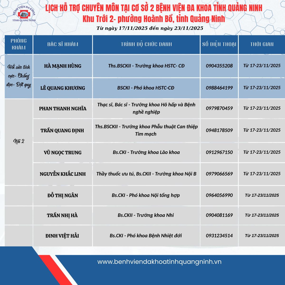 Bệnh viện Đa khoa tỉnh Quảng Ninh xin thông báo danh sách nguồn nhân lực chất lượng cao tăng cường từ cơ sở chính tới làm việc tại cơ sở 2 để phục vụ nhu cầu thăm khám, điều trị và chăm sóc sức khỏe cho nhân dân và các quý khách hàng, đối tác của bệnh viện được biết.