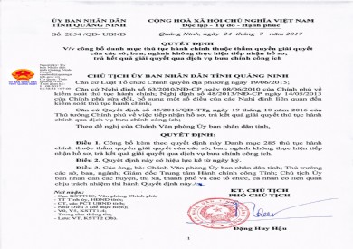 Quyết định v/v Công bố danh mục thủ tục hành chính thuộc thẩm quyền giải quyết của các sở, ban, ngành không thực hiện tiếp nhận hồ sơ, trả kết quả giải quyết qua dịch vụ bưu chính công ích